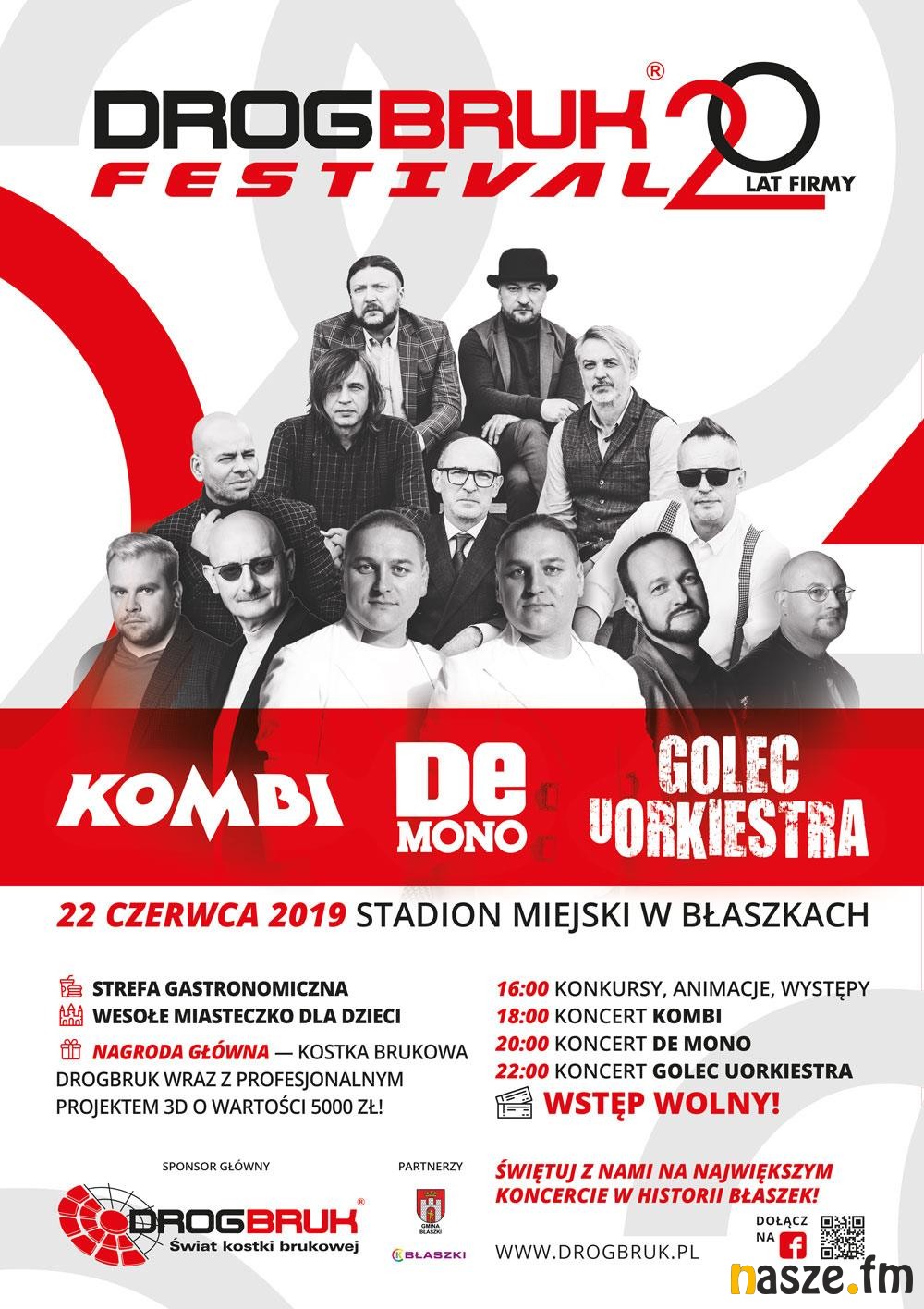 Już w najbliższą sobotę w Błaszkach odbędzie się największa tegoroczna impreza urodzinowa. Swoje 20-lecie obchodzić będzie DrogBruk, czyli rodzinna firma z polskim kapitałem. Na Stadionie Miejskim wystąpią zespoły Kombi, De Mono i Golec uOrkiestra.
