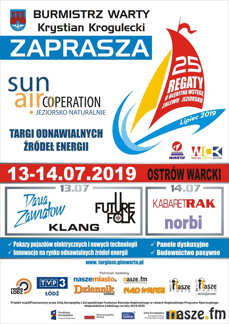 Burmistrz Warty zaprasza na pierwsze w regionie Targi Odnawialnych Źródeł Energii SUN AIR COOPERATION, które odbędą się w dniach 13-14 lipca 2019 r. w Porcie Jachtowym „Jeziorsko” w Ostrowie Warckim. Wydarzenie uświetnią m.in. Daria Zawiałow, Norbi i kabaret RAK. W oba dni na miejsce będzie dojazd i powrót bezpłatnym autokarem.