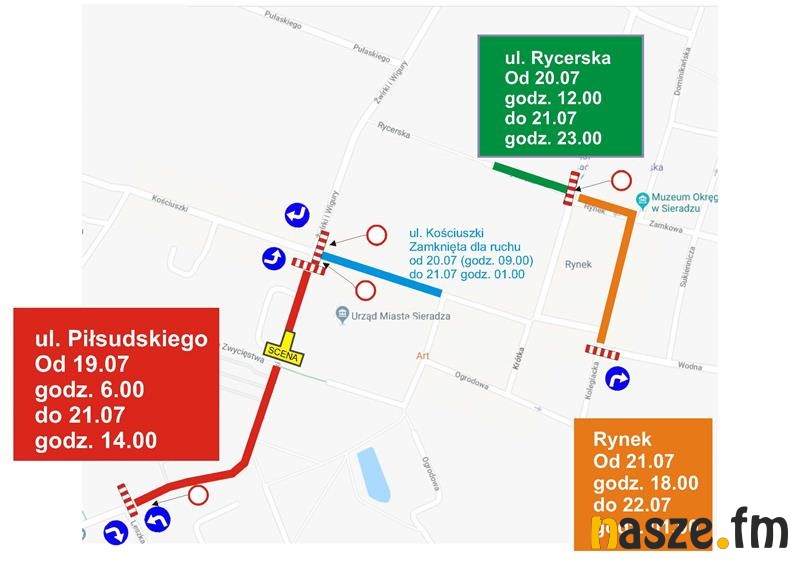 - ul. Kościuszki od skrzyżowania z ul. Piłsudskiego w stronę ul. Ogrodowej od 20.07 godz. 09.00 do 22.07 godz. 01.00