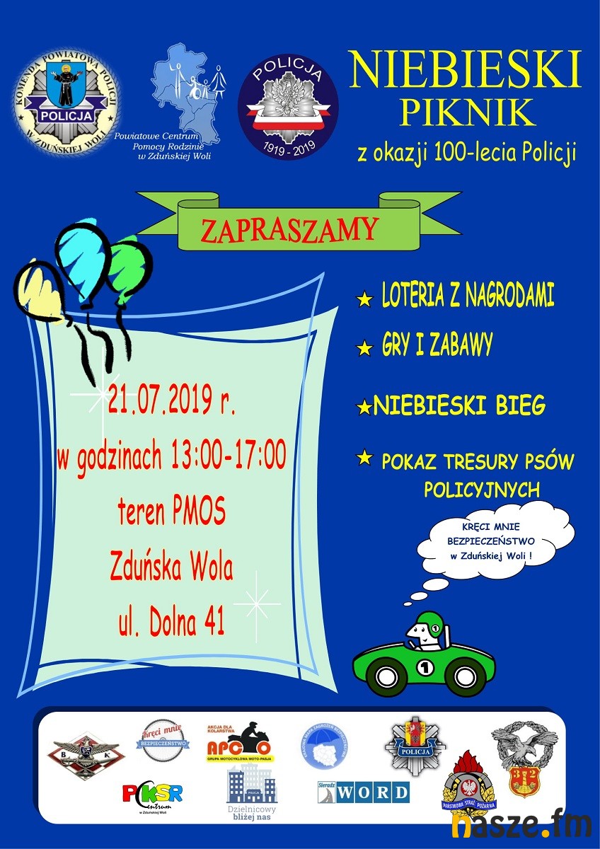 Komenda Powiatowa Policji oraz Powiatowe Centrum Pomocy Rodzinie zapraszają mieszkańców na "Niebieski Piknik" pod hasłem "Kręci mnie bezpieczeństwo w Zduńskiej Woli", który w tym roku organizowany jest z okazji 100-lecia policji. Wydarzenie w najbliższą niedzielę, 21 lipca, odbędzie się na terenie Powiatowego Międzyszkolnego Ośrodka Sportowego przy ul. Dolnej.