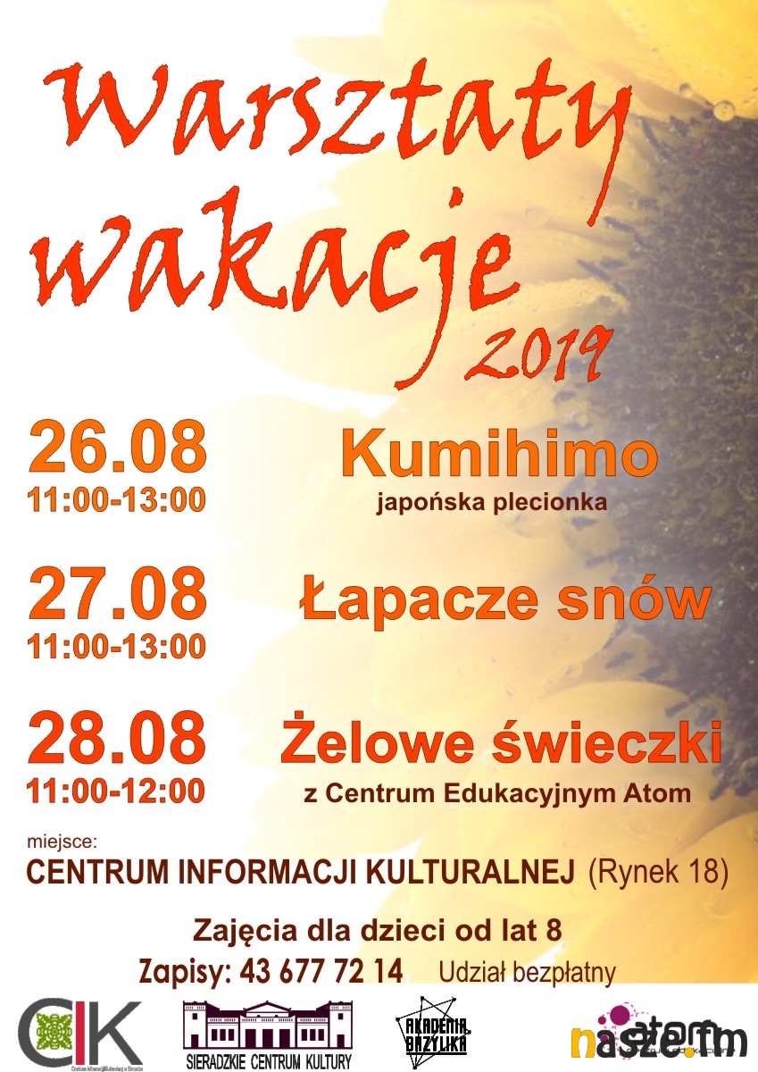 Centrum Informacji Kulturalnej w Sieradzu zaprasza w dniach od 26 do 28 sierpnia na warsztaty podczas, których będzie można poznać japońską sztukę plecionkarską, zrobić łapacze snów czy żelowe świeczki.
