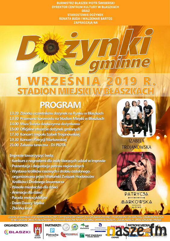 - Tegoroczne dożynki to powrót do tradycji - zapowiada Piotr Świderski, burmistrz Błaszek. Święto gminy rozpocznie dziś o 13:30 od przemarszu mieszkańców ulicami Błaszek na Stadion Miejski. Tu odbędą się główne uroczystości. Zaplanowano też koncerty Izabeli Trojanowskiej i Patrycji Markowskiej.