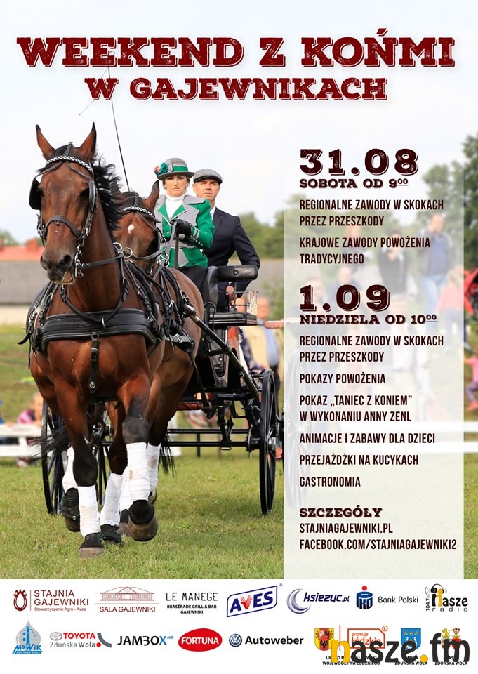 W sobotę do Stajni Gajewniki zjadą się zaprzęgi startujące w Krajowych Zawodach w Powożeniu Tradycyjnym. Nie zabraknie więc pięknych sukien, fraków, kapeluszy, powozów i perfekcyjnie wyszykowanych koni. Przez cały nadchodzący weekend trwać będą natomiast Regionalne Zawody w Skokach Przez Przeszkody - IV Memoriał Andrzeja Kubika. Do tego na niedzielę zaplanowano m.in. "Taniec z koniem" w wykonaniu Anny Zenl, pokazy powożenia, animacje, atrakcje i konkursy dla dzieci, dmuchańce.