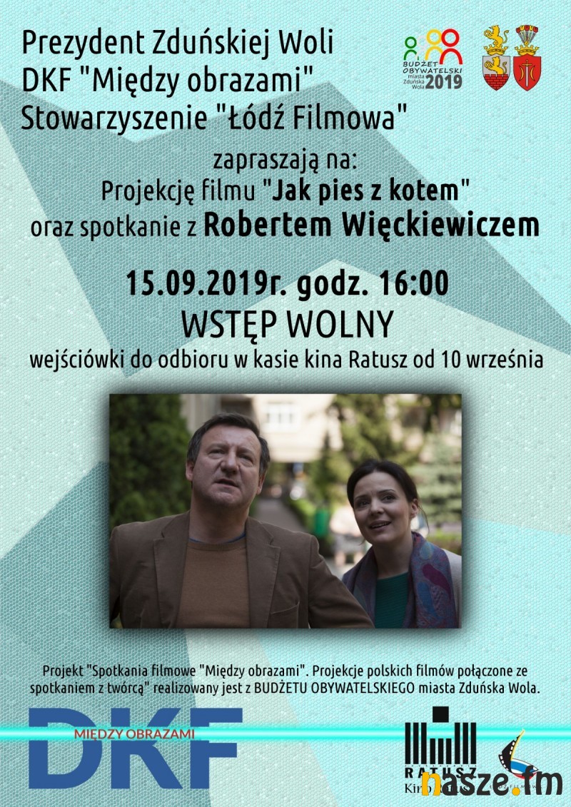 Dzień później, w niedzielę o 16 projekcja filmu Jak pies z kotem oraz spotkanie z Robertem Więckiewiczem. Wstęp wolny - wejściówki do odbioru w kasie kina. Projekt "Spotkania filmowe "Między obrazami". Projekcje polskich filmów połączone ze spotkaniem z twórcą" realizowany jest z Budżetu Obywatelskiego miasta Zduńska Wola.