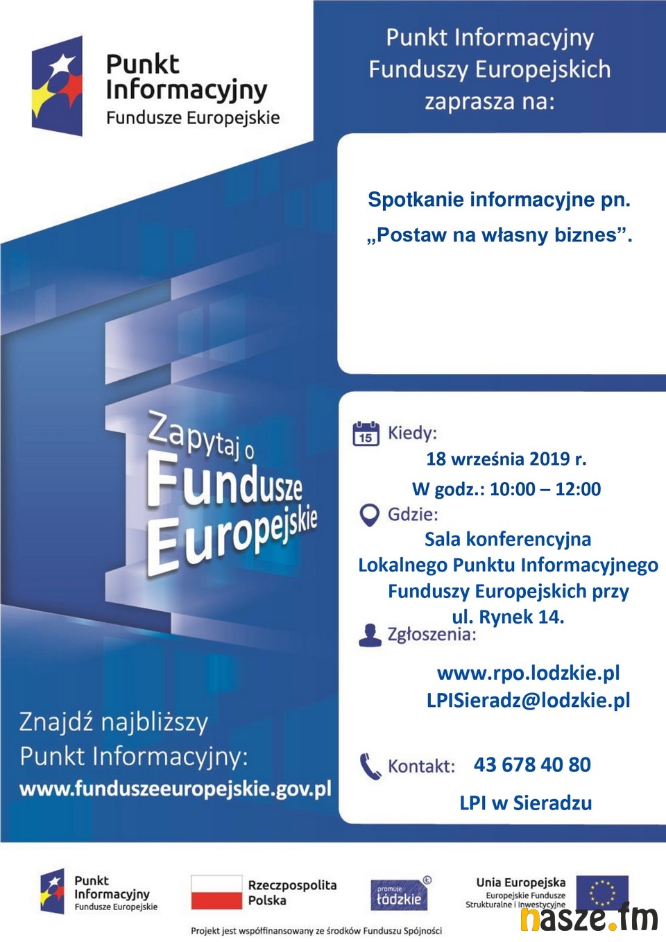 Spotkanie odbędzie się 18 września 2019 roku w godz. 10:00 – 12:00 (rekrutacja od godziny 9:45), sala konferencyjna Lokalnego Punktu Informacyjnego Funduszy Europejskich w Sieradzu, ul. Rynek 14.