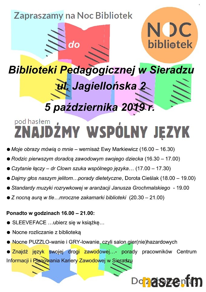 W tym roku Noc Bibliotek po raz pierwszy odbywa się jesienią. W tę ogólnopolską akcję, zaplanowaną na sobotę 5 października, włączyły się Miejska i Gminna Biblioteka w Szadku,w biblioteka Szkoły Podstawowej w Warcie, a także Biblioteka Pedagogiczna w Sieradzu. - W tym roku jest to już V edycja tego wydarzenia. Spotykamy się pod hasłem "Znajdźmy wspólny język" - zapowiada Elżbieta Kowalska, dyrektor BP w Sieradzu.