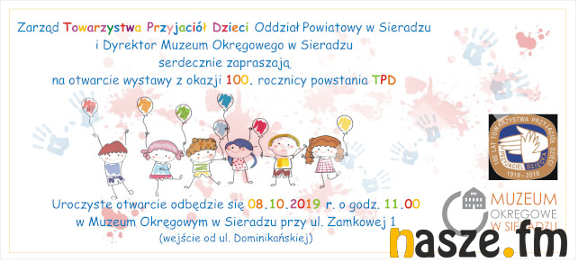 Zarząd Towarzystwa Przyjaciół Dzieci Oddział Powiatowy w Sieradzu i Dyrektor Muzeum Okręgowego w Sieradzu zapraszają dziś na otwarcie wystawy z okazji 100. rocznicy powstania TPD.