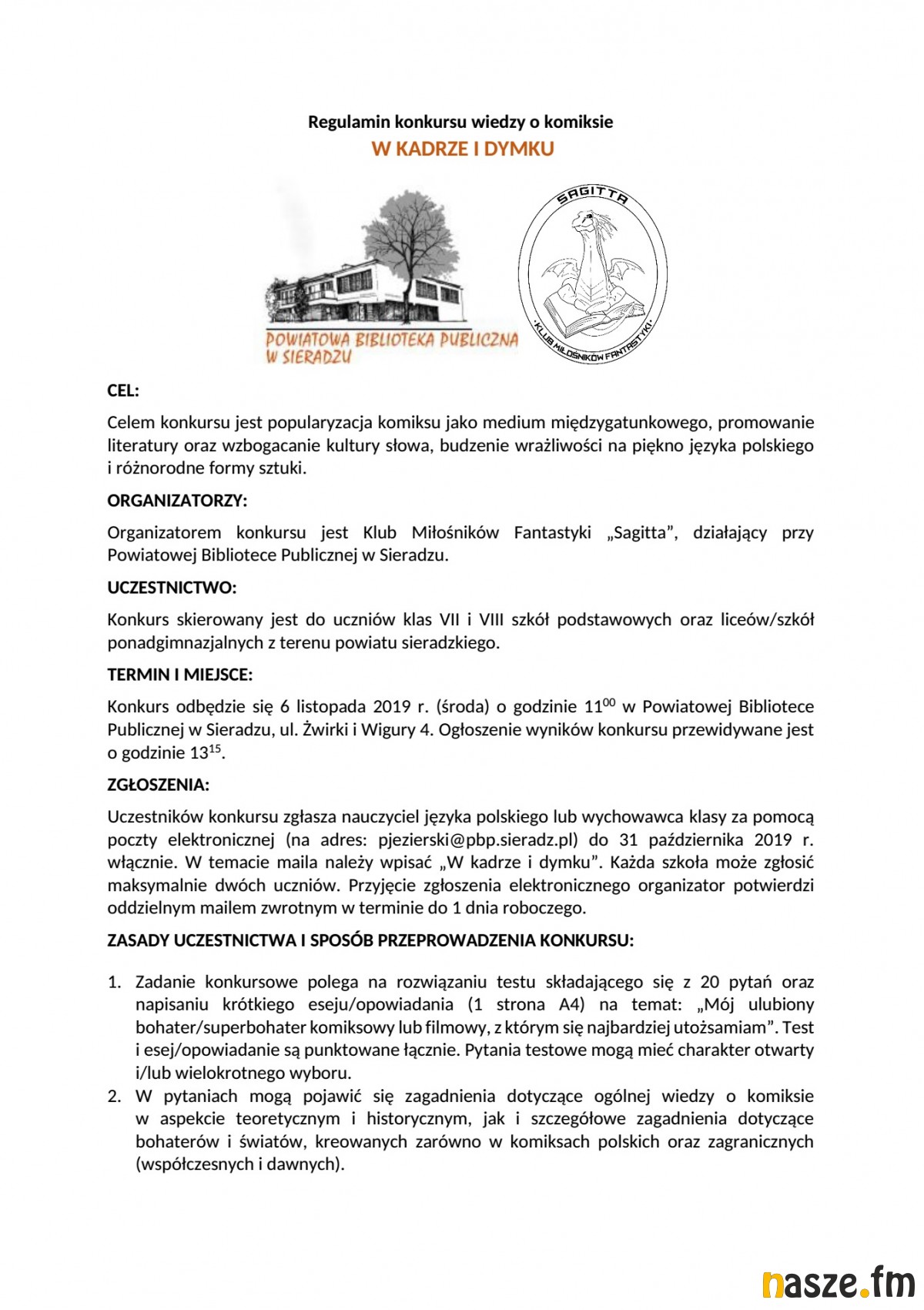 Konkurs odbędzie się 6 listopada 2019 r. (środa) o godz. 11:00 w siedzibie PBP w Sieradzu, ul. Żwirki i Wigury 4. Na zgłoszenia organizatorzy czekają do 31 października włącznie.Te powinni w imieniu uczniów przesłać wychowawcy lub poloniści na adres: pjezierski@pbp.sieradz.pl. Nagrodami w konkursie będą książki i komiksy. Fundatorem części nagród jest Wydawnictwo Egmont.