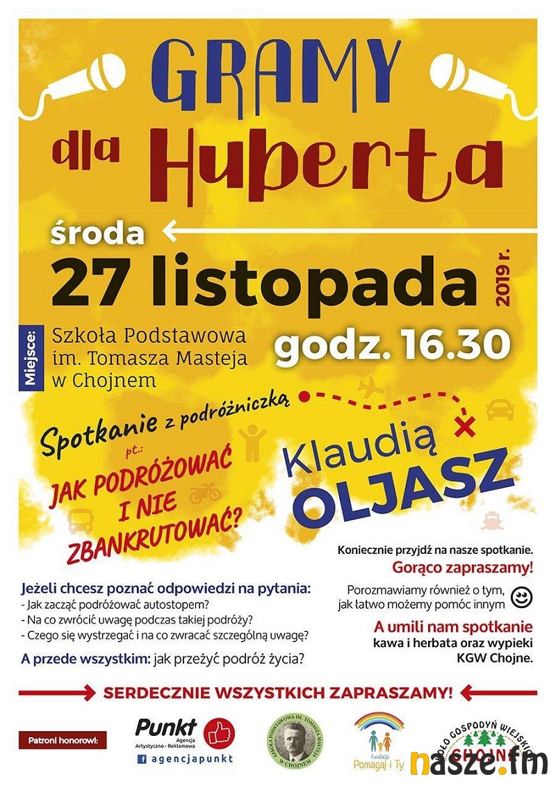 Dziś w Szkole Podstawowej im. Tomasza Masteja w Chojnem odbędzie się spotkanie charytatywne dla Huberta Brejnera. Gościem specjalnym będzie podróżniczka Klaudia Oljasz.