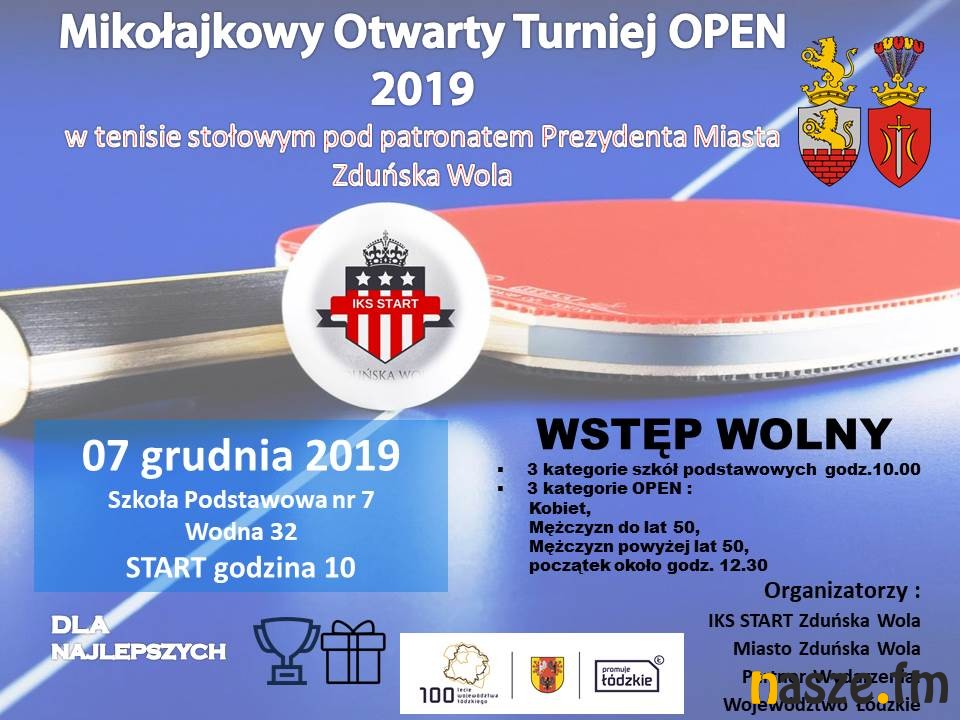 Klub IKS START Zduńska Wola zaprasza na Mikołajkowy Otwarty Turniej OPEN 2019 w tenisa stołowego pod patronatem Prezydenta Miasta Zduńska Wola. Impreza odbędzie się w sobotę w hali Szkoły Podstawowej nr 7 w Zduńskiej Woli. Początek zmagań o 10:00.