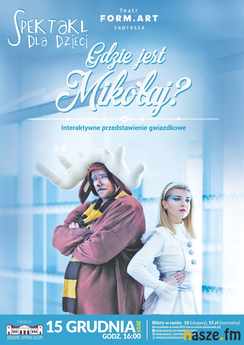 Renifer Olaf i Śnieżynka, bohaterowie bajki, są w trakcie burzliwych przygotowań świątecznych. On - pesymista i burczymucha, ona - żywiołowa i zawsze uśmiechnięta. Niespodziewanie stają przed nie lada wyzwaniem - muszą połączyć swoje siły, by uratować Boże Narodzenie i odnaleźć Świętego Mikołaja, który utknął gdzieś pod Kutnem. Gwiazdka stoi pod wielkim znakiem zapytania. Czy uda im się w porę odnaleźć Świętego Mikołaja? Czy dzieci dostaną prezenty w tym roku nim będzie za późno? Wszystko w ich rękach! Dzięki tej inscenizacji z pewnością każdemu widzowi udzieli się świąteczna, magiczna atmosfera. Bohaterowie wciągną nas w wir świątecznej przygody. Obok głównych wątków prezentowanej historii, specjalnie z myślą o najmłodszych odbiorcach, w spektaklu pojawią się rozmaite konkursy, wesołe piosenki do wspólnego odśpiewania oraz układy taneczne sprzyjające stworzeniu niezwykle pozytywnej atmosfery."Gdzie jest Mikołaj?" to muzyczne widowisko dla najmłodszych, pełne gier i konkursów, które bawi, uczy oraz pokazuje, jak ważna jest przyjaźń oraz współpraca.
