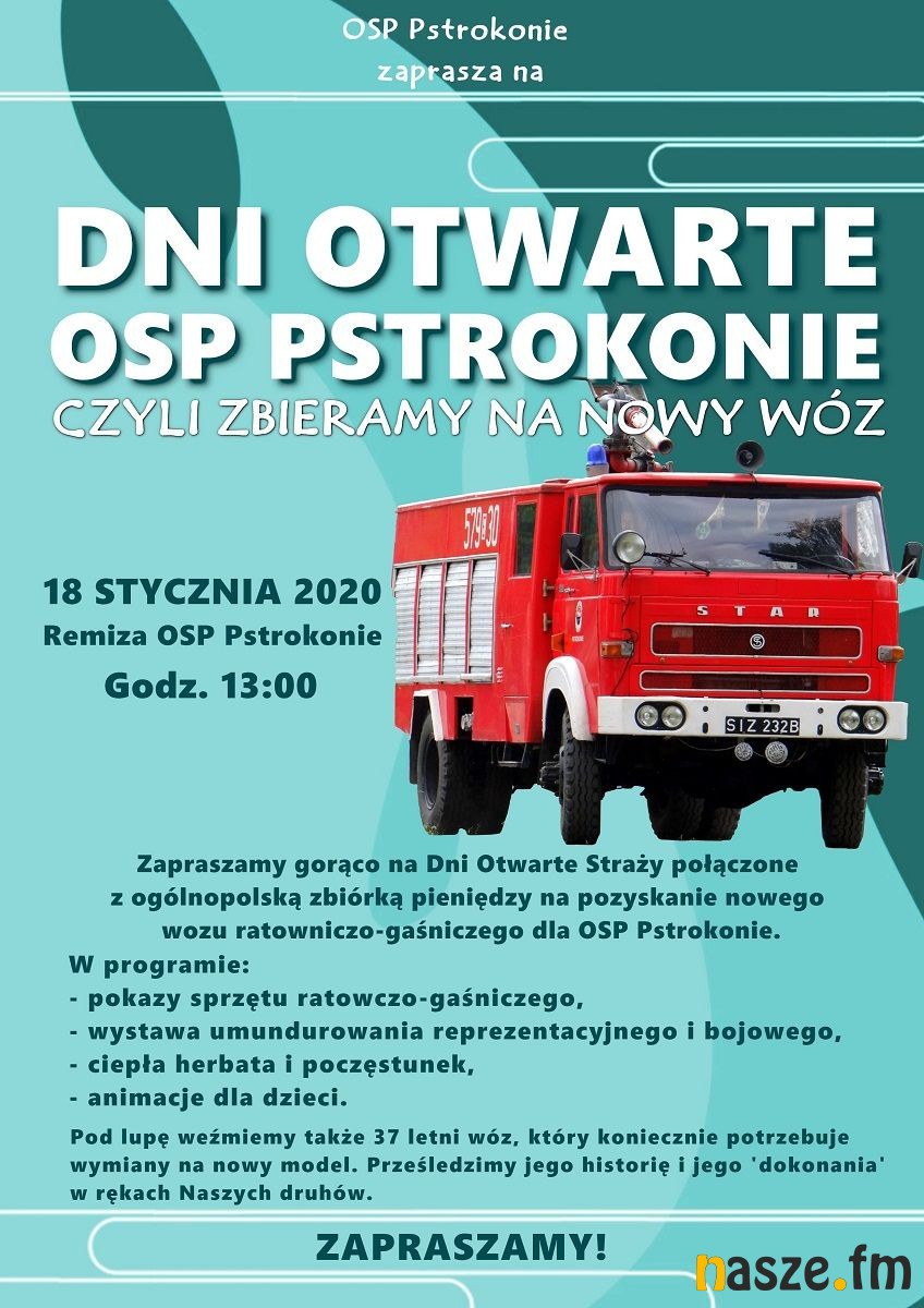 Ochotnicza Straż Pożarna w Pstrokoniach zaprasza do siebie w najbliższą sobotę, 18 stycznia, na dzień otwarty. Wydarzenie połączone będzie ze zbiórką pieniędzy na zakup nowego wozu ratowniczo-gaśniczego dla druhów ochotników z tej jednostki.