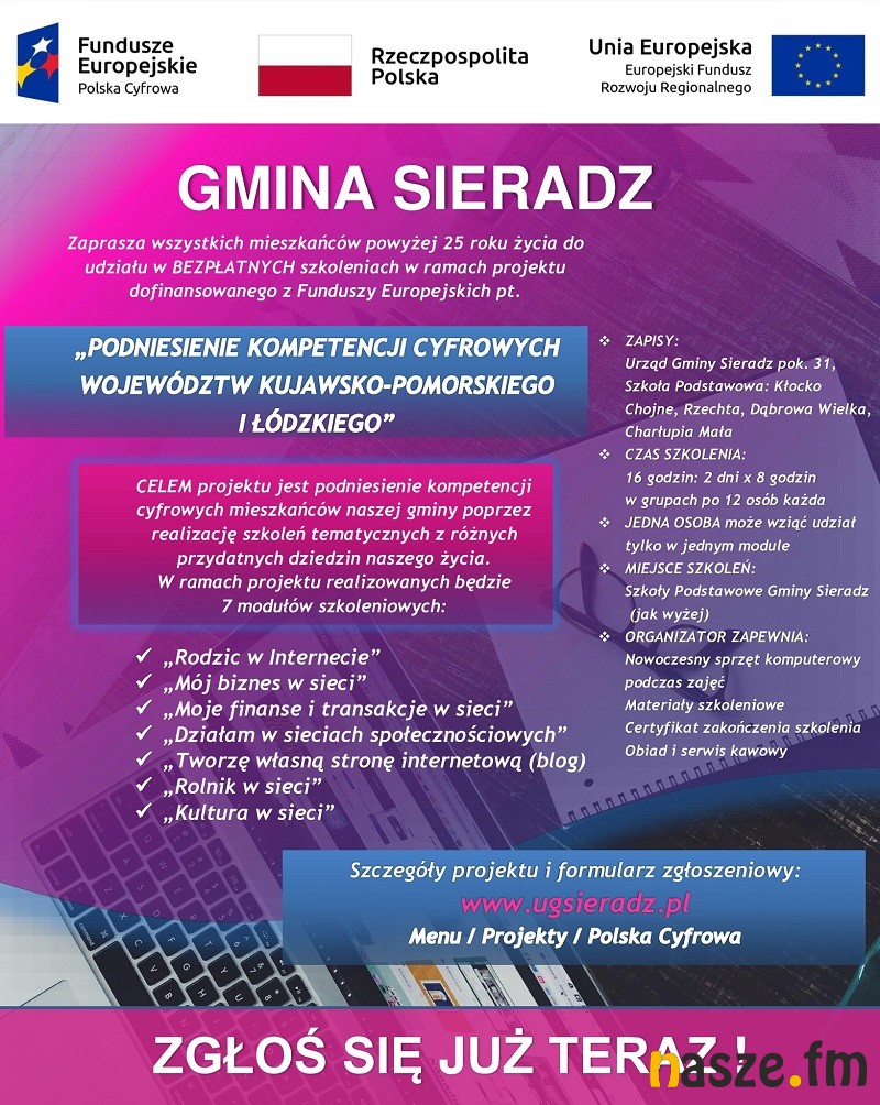 Gmina Sieradz zaprasza mieszkańców tej części regionu na bezpłatne szkolenia dotyczące podniesienia kompetencji cyfrowych.