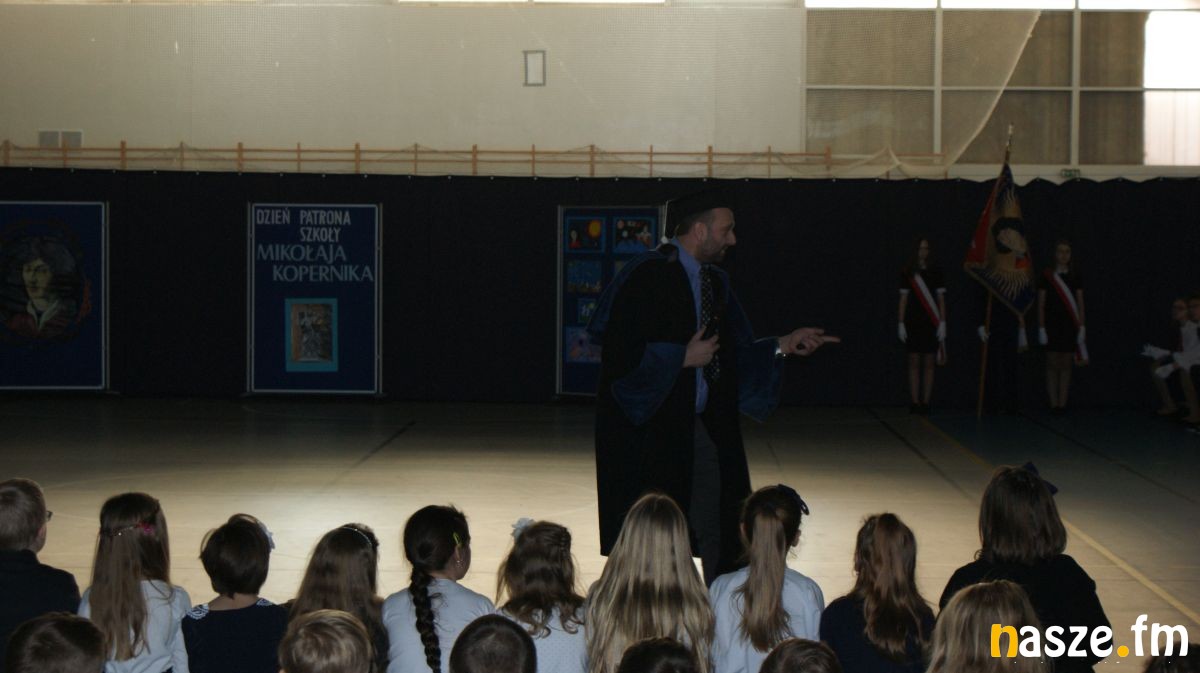 Gościem Specjalnym, który został zaproszony do szkoły był dr Adrian Topolski – pracownik naukowy Wydziału Chemicznego Uniwersytetu M. Kopernika w Toruniu, który przyjechał z wykładem dotyczącym Mikołaja Kopernika - jego mniej znanych osiągnięć i talentów. Miło było usłyszeć, że wszyscy: my społeczność SP6 i pracownicy oraz słuchacze Uniwersytetu, jesteśmy jakby jedną Rodziną, bo mamy tego samego Patrona. Zaproszony gość przybliżył wszystkim istotę obu teorii: geo- i heliocentrycznej. Opowiadając o Koperniku jako ekonomie wyjaśnił teorię wartości rynkowej pieniądza, którą opisał Kopernik, wszyscy zrozumieli jaki był wkład Patrona - stratega w obronę Olsztyna przed Krzyżakami i próbowali zrozumieć twierdzenie Kopernika i jego dwóch poprzedników o współistniejących: ruchu obrotowym i prostoliniowym.