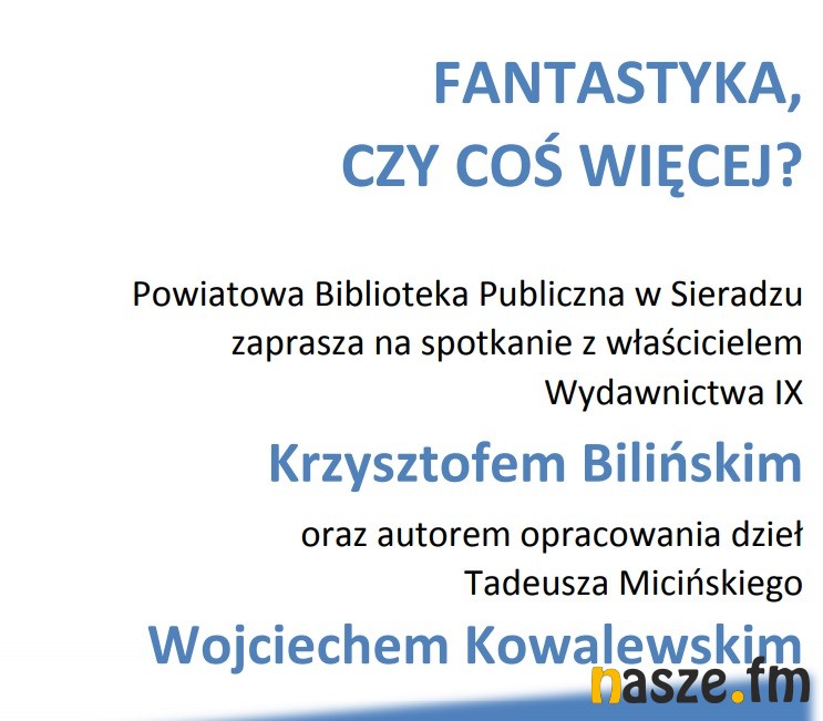 Powiatowa Biblioteka Publiczna w Sieradzu zaprasza 27 lutego na spotkanie z Krzysztofem Bilińskim, właścicielem Wydawnictwa IX i Wojciechem Kowalewskim, autorem opracowania dzieł Tadeusza Micińskiego - "Fantastyka, czy coś więcej?". Goście przedstawią mniej znane, ale ważne i wartościowe dzieła literackie, wydawane w niszowych wydawnictwach.