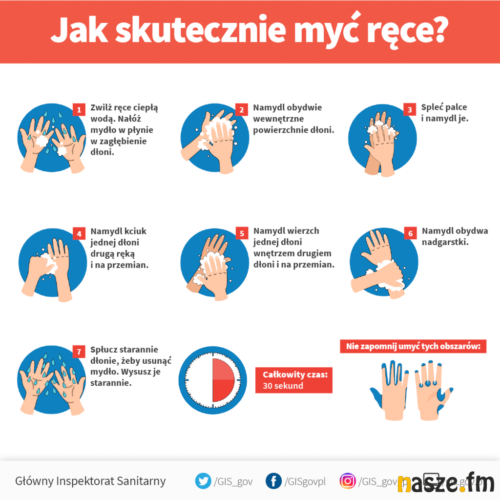 Należy pamiętać o częstym myciu rąk wodą z mydłem, a jeśli nie ma takiej możliwości dezynfekować je płynami/żelami na bazie alkoholu (min. 60%). Istnieje ryzyko przeniesienia wirusa z zanieczyszczonych powierzchni na rękach. Dlatego częste mycie rąk zmniejsza ryzyko zakażenia.