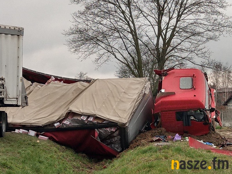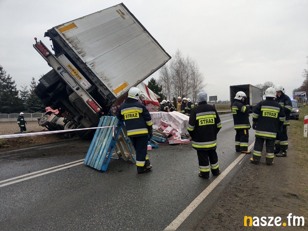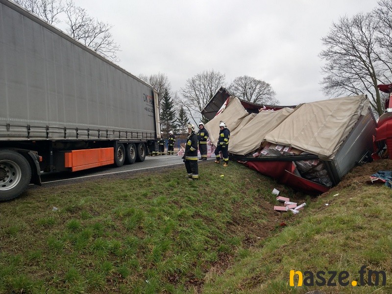 Samochód przewoził artykułu spożywcze. Służby musiały przeprowadzić przeładunek towaru, ponieważ naczepa została uszkodzona, a ten znalazł się w rowie i na drodze. Samochód musiał też zostać wyciągnięty z rowu.