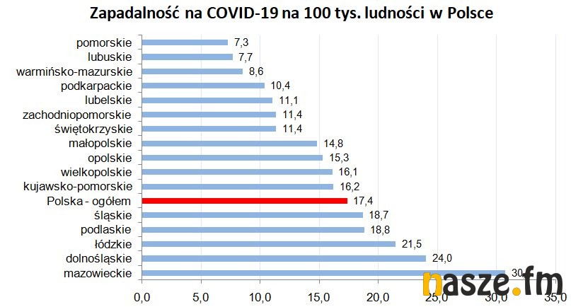 Zapadalność w Polsce na Covid-19 na 100 tys. wynosi 17,4. Najwyższe wskaźniki odnotowujemy w województwie mazowieckim – 30,7; dolnośląskim – 24,0; łódzkim – 21,5.