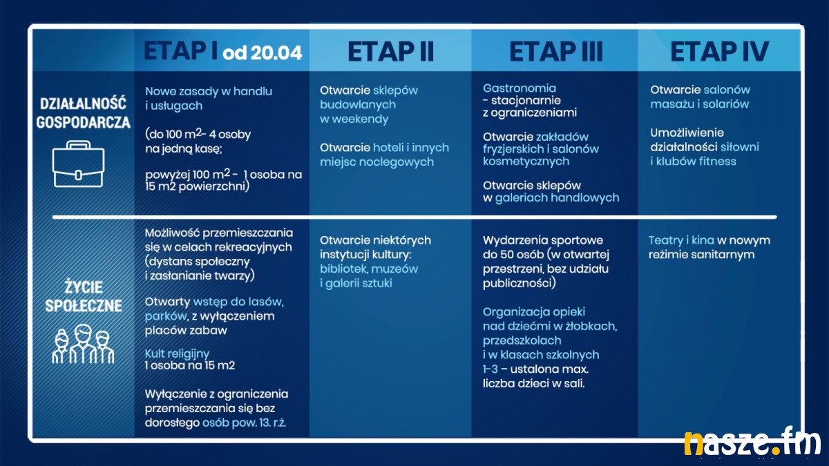 Od dziś, 20 kwietnia, stopniowo będą zmniejszać się obostrzenia wprowadzone przez rząd w związku z pandemią koronawirusa. To m.in. otwarcie lasów i parków czy większa swoboda podczas robienia zakupów.