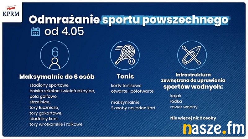 Złagodzone zostaną kolejne obostrzenia dotyczące uprawiania sportu. Dotyczą nie tylko zawodowców, ale i amatorów. Od 4 maja otwarte będą, m.in. boiska szkolne (w tym Orliki), stadiony i korty tenisowe. Sport będzie można uprawiać, ale jedynie przy zachowaniu odpowiednich środków bezpieczeństwa.