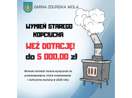 Po raz kolejny mieszkańcy Gminy Zduńskiej Woli mogą skorzystać z dotacji w wysokości do 5 tys. zł na wymianę w tym roku starego kotła węglowego na ekologiczne źródło ciepła. Nabór wniosków prowadzony jest sposób ciągły do wyczerpania środków finansowych zapisanych w budżecie gminy na ten cel.