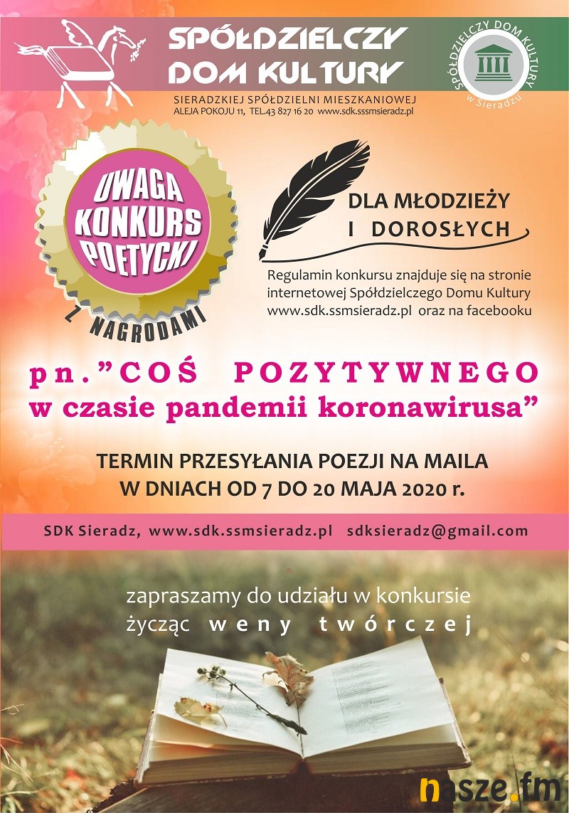 Spółdzielczy Dom Kultury w Sieradzu zachęca do wzięcia udziału w konkursie poetyckim pn. "Coś pozytywnego w czasie pandemii koronawirusa". Konkurs jest skierowany do młodzieży i dorosłych. Termin przesyłania poezji został przedłużony do 25 maja.