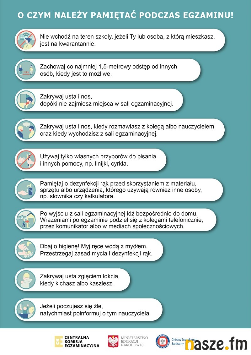 Centralna Komisja Egzaminacyjna, Ministerstwo Edukacji Narodowej oraz Główny Inspektorat Sanitarny przygotowały wytyczne dotyczące organizowania i przeprowadzania egzaminów zewnętrznych: ósmoklasisty, gimnazjalnego, maturalnego, potwierdzającego kwalifikacje w zawodzie oraz zawodowego w 2020 r.