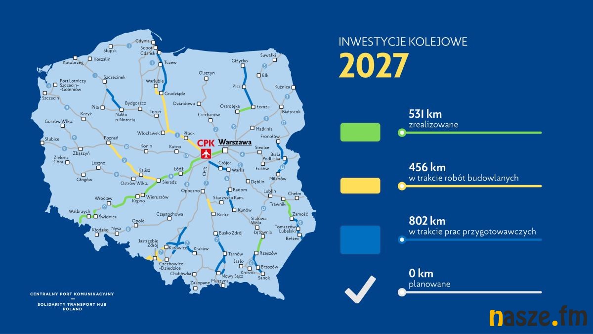 Przygotowywana w ramach projektu CPK linia KDP Warszawa-CPK-Łódź-Wrocław/Poznań ze względu na swój kształt określana jest jako „igrek”. Pociągi na tej linii mają jeździć z prędkością do 250 km/godz. Zakładany czas przejazdu między Warszawą i Łodzią to 45 minut. Do Portu Lotniczego Solidarność warszawiacy dojadą w kwadrans, a łodzianie w niespełna pół godziny. Zakładany czas przejazdu z Warszawy do Wrocławia to 1 godz. 55 minut.