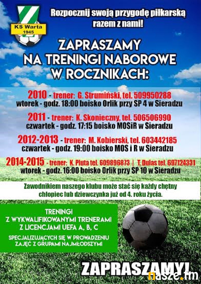 Klub Warta Sieradz zaprasza młodych piłkarzy z roczników 2010-2015 na treningi naborowe. Zajęcia odbywać się będą we wtorki i czwartki.