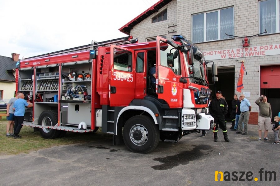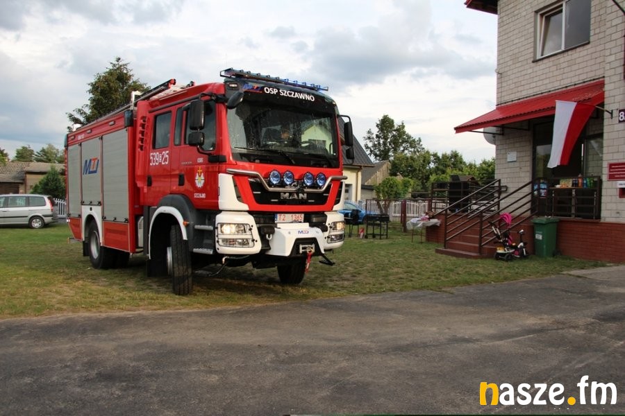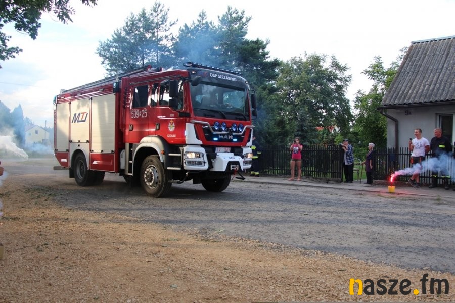 Do Ochotniczej Straży Pożarnej w Szczawnie (gm. Burzenin) dotarł długo wyczekiwany samochód pożarniczy. Nowy MAN TGM 18.320 4X4 BB został przywitany racami, fontanną wodną i oklaskami.