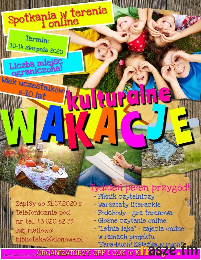 Gminna Biblioteka Publiczna i Gminny Ośrodek Kultury w Klonowej zapraszają na wakacyjne zajęcia pod hasłem "Kulturalne wakacje". W programie m.in. piknik czytelniczy, warsztaty literackie, gra terenowa i wiele innych atrakcji. Zajęcia są przeznaczone dla dzieci od 6 do 10 roku życia.