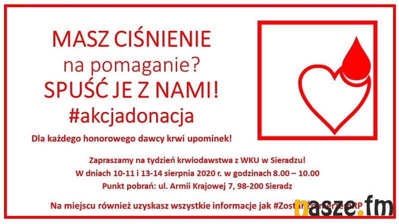 W ramach Tygodnia Krwiodawstwa z WKU płynem życia będzie można dzielić się w punkcie krwiodawstwa na terenie Szpitala Wojewódzkiego przy ul. Armii Krajowej w Sieradzu. Organizatorzy akcji czekają na chętnych w dn. 10-11.08. oraz 13-14.08.br. w godz. 8-10. Warto pamiętać o lekkim śniadaniu i obowiązkowo zabrać swój dowód osobisty.