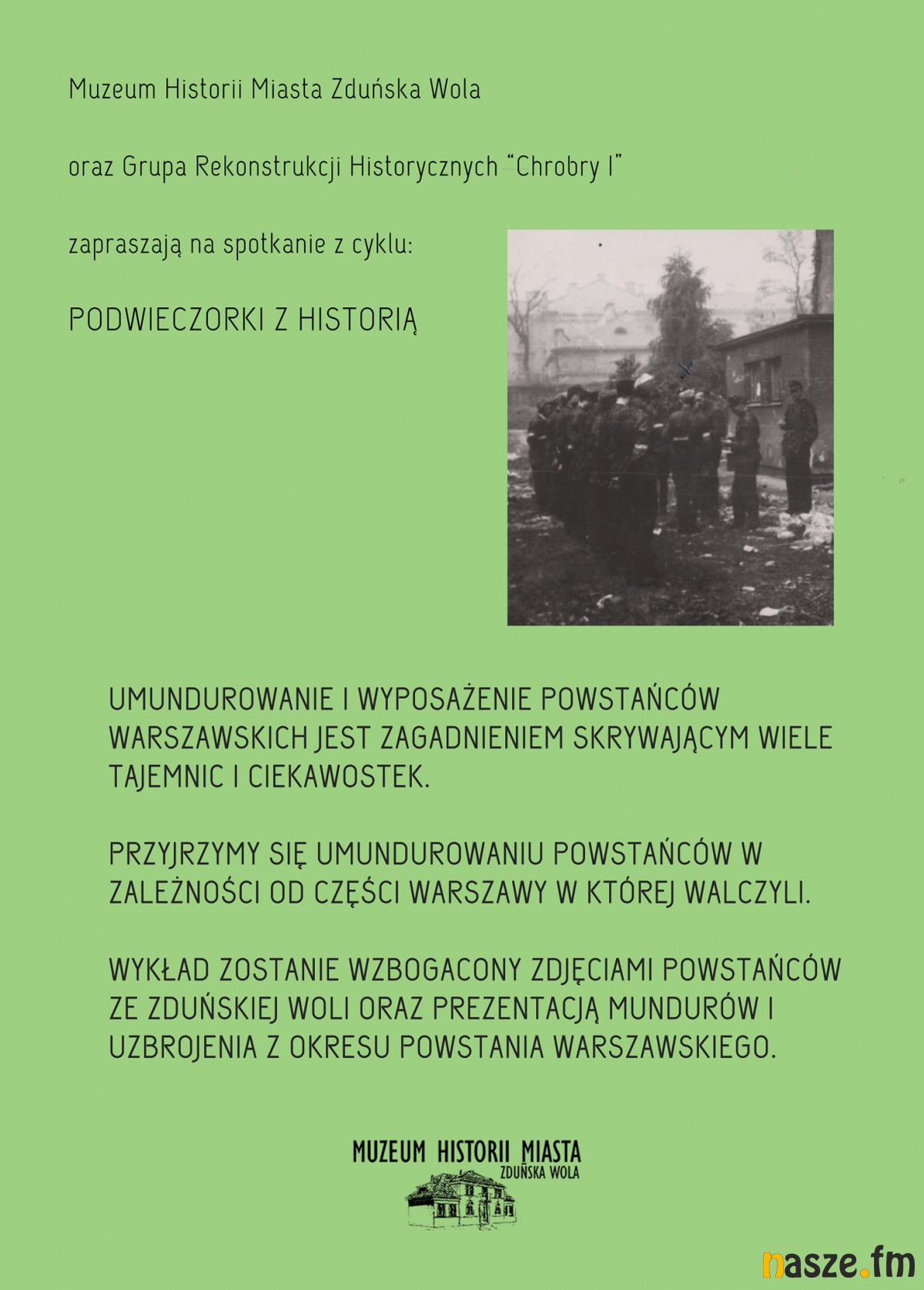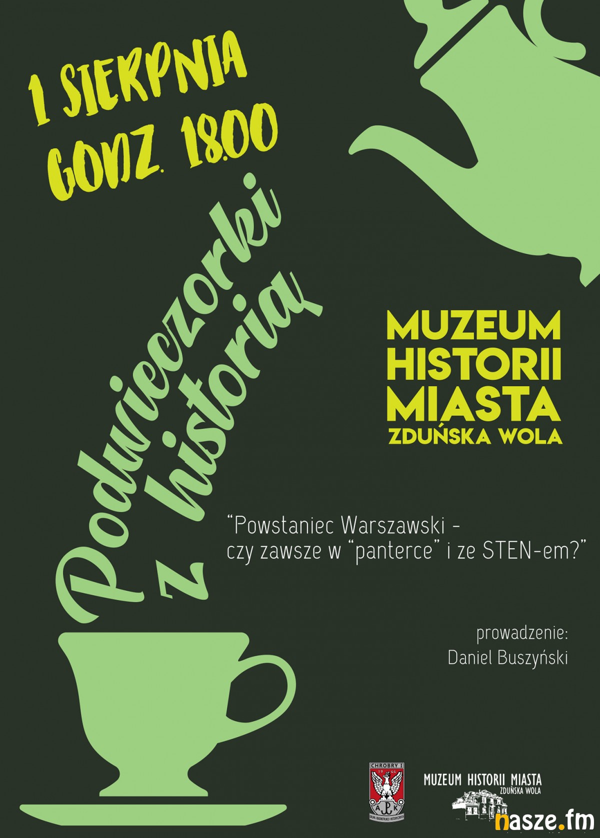 Natomiast o godz. 18:00 w Muzeum Historii Miasta Zduńska Wola odbędzie się spotkanie z cyklu "Podwieczorki z historią" pt. "Powstaniec Warszawski - czy zawsze w "panterce" i ze STEN-em?".
