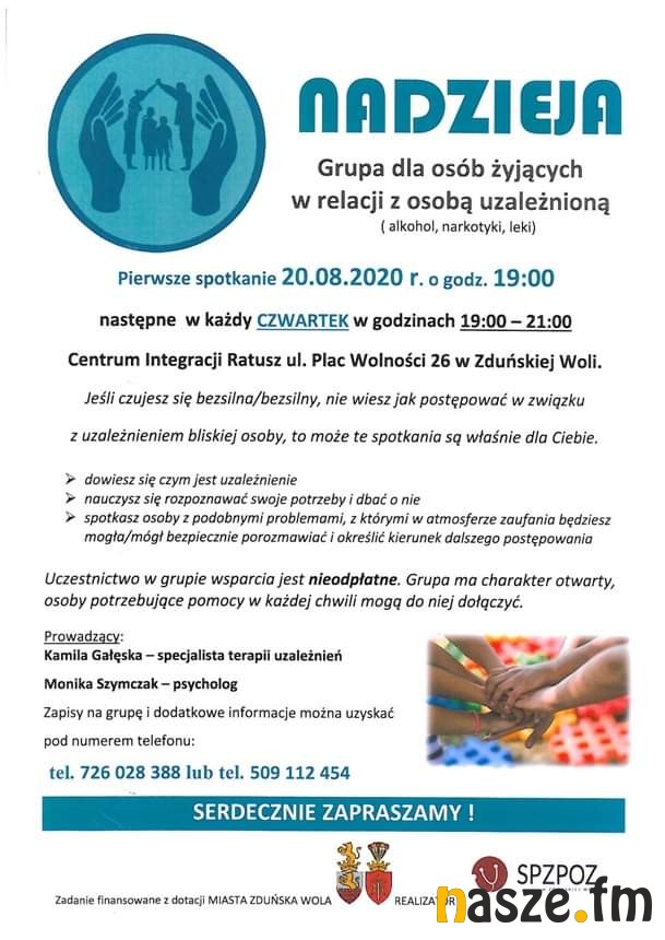 W Zduńskiej Woli powstała grupa wsparcia "Nadzieja" dla osób żyjących w relacji z osobą uzależnioną. Dziś, 20 sierpnia, w zduńskowolskim Ratuszu odbędzie się pierwsze spotkanie nowo powstałej grupy.