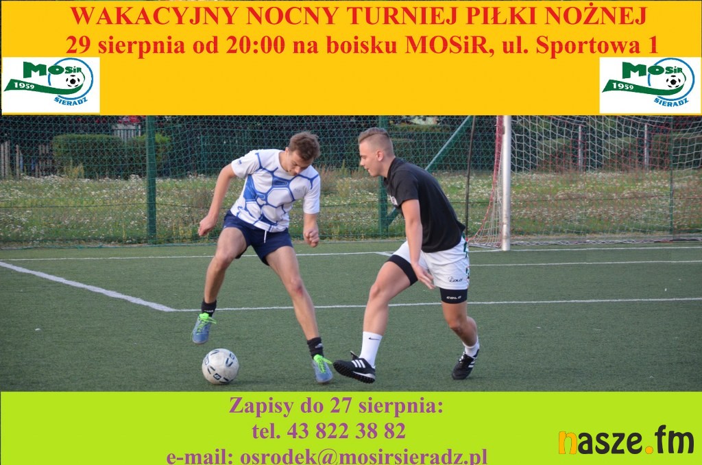 Następnie o 20:00 na sztucznym boisku MOSiR-u przy Sportowej ruszy Wakacyjny Nocny Turniej Piłki Nożnej. W rozgrywkach wezmą udział drużyny 6-osobowe. Zawody odbywają się w kategorii OPEN.