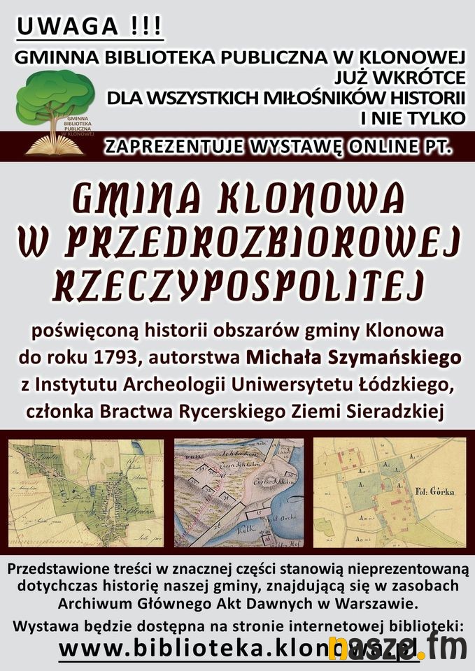 Gminna Biblioteka Publiczna w Klonowej podejmuje kolejne działanie skupione wokół historii gminy Klonowa. Po wydaniu kwartalnika PTTK "Na Sieradzkich Szlakach" poświęconego w całości Klonowej, pikniku edukacyjnym "Folwark nad Strugą", spotkaniu pt. "O przekuwaniu żelaza w klonowskich kuźnicach" przyszedł czas na wystawę poświęconą historii obszarów gminy Klonowa do 1793 r. Autorem wystawy jest Michał Szymański z Instytutu Archeologii Uniwersytetu Łódzkiego, Członek Bractwa Rycerskiego Ziemi Sieradzkiej, autor artykułów historycznych o Klonowej i okolicznych miejscowościach.
