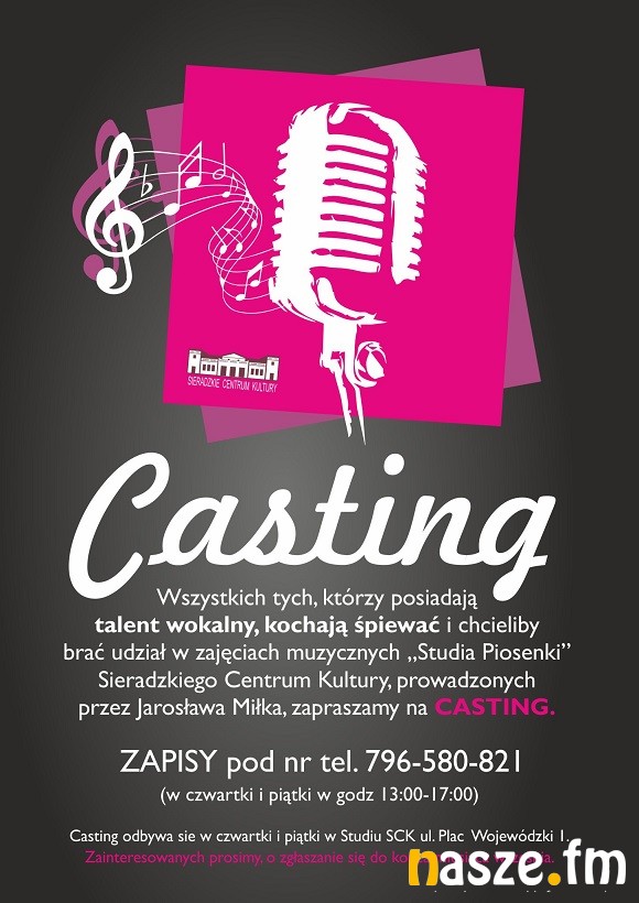 Zajęcia w ramach "Studia piosenki" w Sieradzkim Centrum Kultury prowadzi Jarosław Miłek. Przesłuchania odbywają się do końca września w czwartki i piątki w godz. od 13:00 do 17:00 w studiu SCK (ul. Plac Wojewódzki 1). Do udziału w castingu trzeba się zgłosić telefonicznie dzwoniąc pod nr tel. 796-580-821.