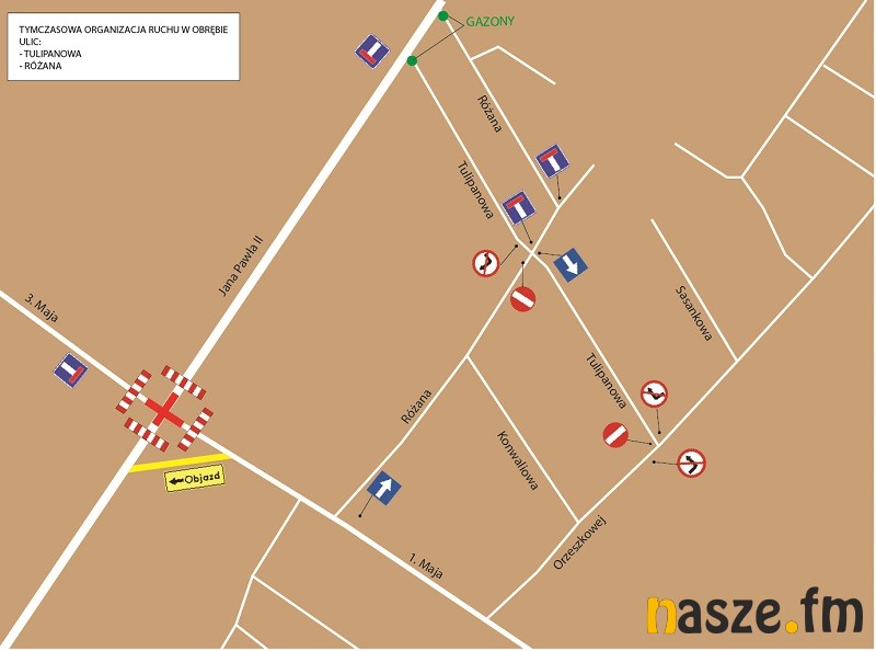 Od dzisiaj (17 września) nie będzie można wjechać z ul. Jana Pawła II w ulice Różaną i Tulipanową. Analogicznie z obu tych ulic nie będzie też można wjechać na ul. Jana Pawła II.