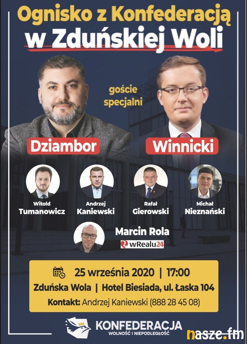 Klub Konfederacji Zduńska Wola zaprasza sympatyków na ognisko, które w najbliższy piątek, 25 września, odbędzie się w Biesiadzie przy ul. Łaskiej 104 w Zduńskiej Woli. Na wydarzeniu pojawią się czołowi działacze Konfederacji m.in. Artur Dziambor, Robert Winnicki czy Dobromir Sośnierz.