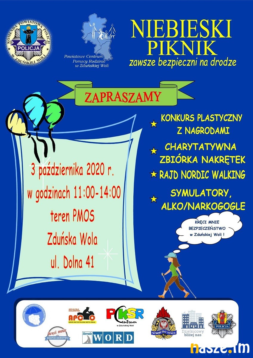 Komendant Powiatowy Policji oraz dyrektor Powiatowego Centrum Pomocy Rodzinie w Zduńskiej Woli zapraszają mieszkańców na Niebieski Piknik pod hasłem "Zawsze bezpieczni na drodze". Czwarta edycja tej imprezy w najbliższą sobotę, 3 października, odbędzie się na terenie Powiatowego Międzyszkolnego Ośrodka Sportowego przy ul. Dolnej 41. Tradycyjnie nie zabraknie licznych atrakcji.