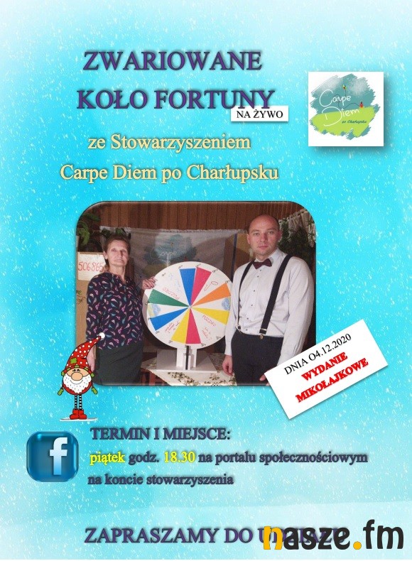 Stowarzyszenie Carpe Diem po Charłupsku organizuje piątkowe zabawy on-line na swoim profilu na Facebooku pt" Zwariowane Koło Fortuny". Podczas transmisji na żywo można zadzwonić do studia i zagrać.