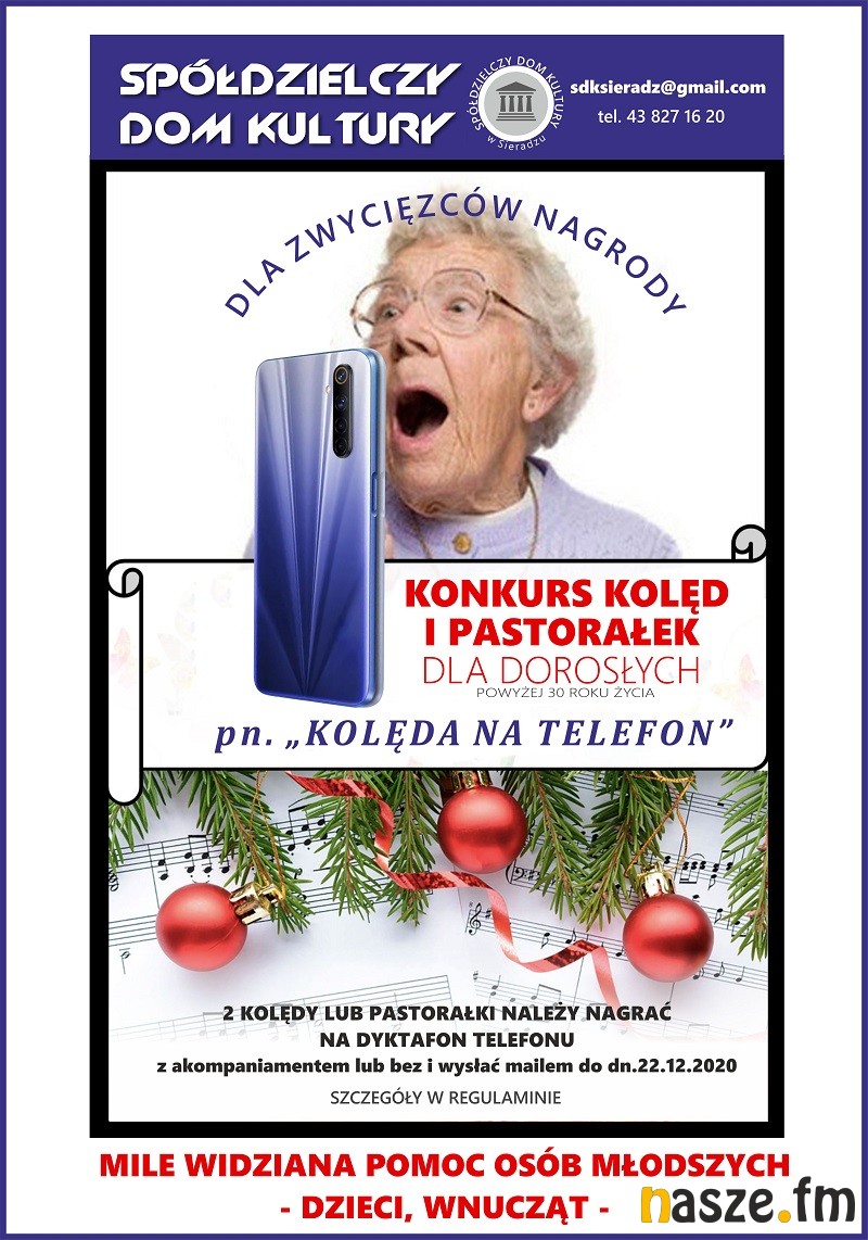 Spółdzielczy Dom Kultury w Sieradzu zaprasza do udziału w konkursie kolęd i pastorałek "Kolęda na telefon". Konkurs skierowany jest dla dorosłych powyżej 30 roku życia. Utwory można wysyłać do 22 grudnia.