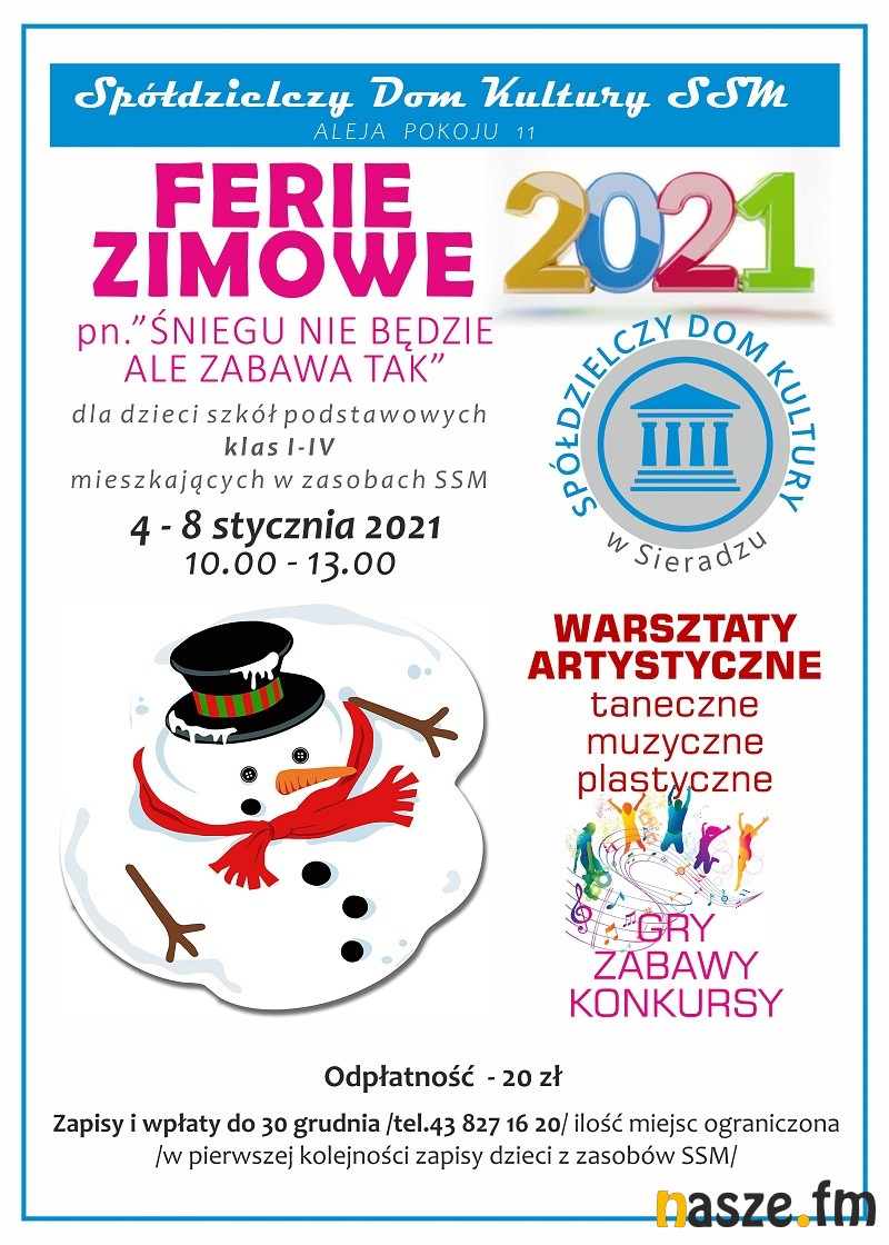 Spółdzielczy Dom Kultury zaprasza na ferie zimowe "Śniegu nie będzie, ale zabawa tak". Zajęcia potrwają od 4 do 8 stycznia. Są przeznaczone dla dzieci szkół podstawowych klas I-IV mieszkających w zasobach Sieradzkiej Spółdzielni Mieszkaniowej.