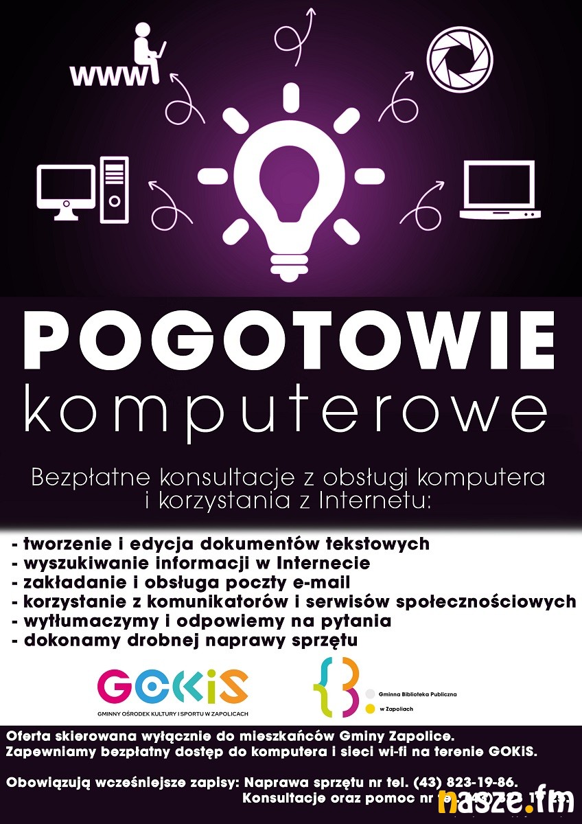 W Gminnym Ośrodku Kultury i Sportu w Zapolicach można skorzystać z bezpłatnych konsultacji z obsługi komputera i korzystania z internetu. Projekt jest wspólną inicjatywą zapolickiego domu kultury i gminnej biblioteki publicznej.