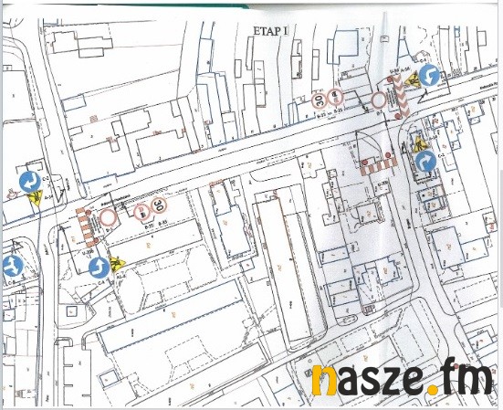 Na załączonej mapce pokazujemy reorganizację ruchu przy pierwszym etapie robót.