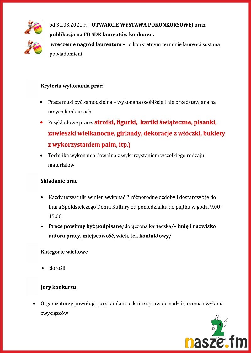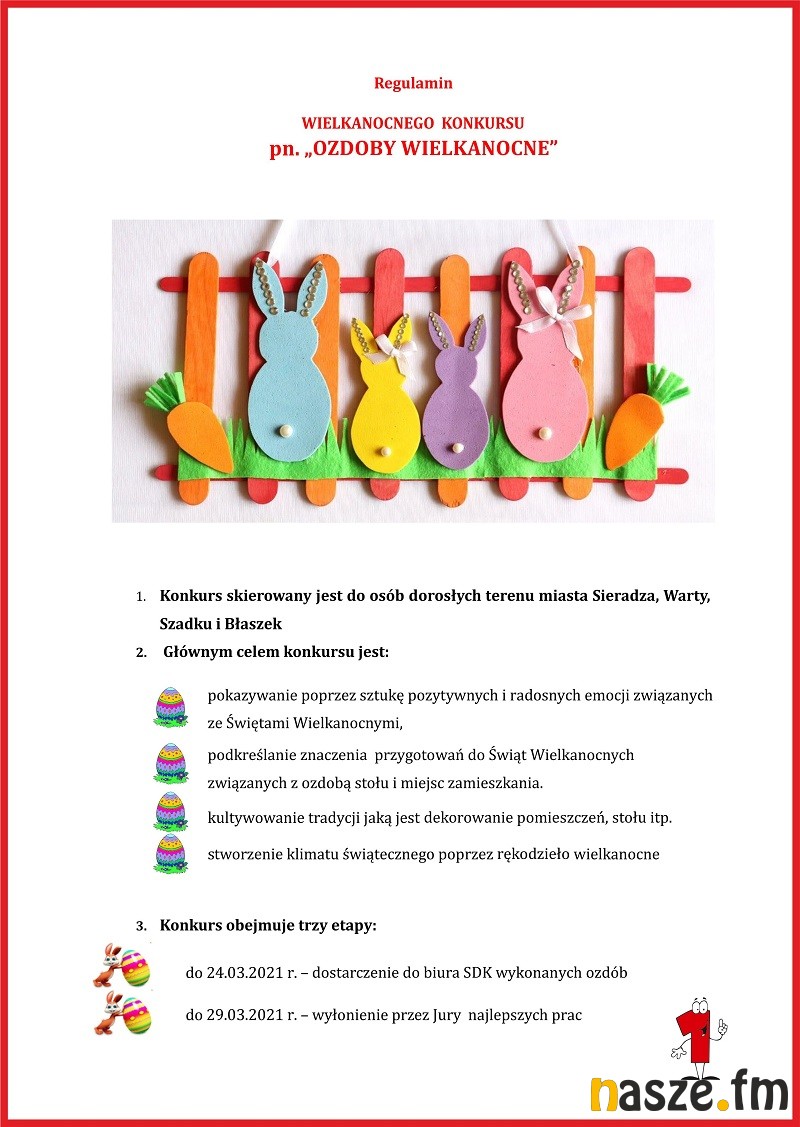 Spółdzielczy Dom Kultury w Sieradzu zaprasza na wielkanocny konkurs "Ozdoby wielkanocne". Konkurs skierowany jest do osób dorosłych z terenu miasta Sieradza, Warty, Szadku i Błaszek. Prace należy dostarczyć do 24 marca.