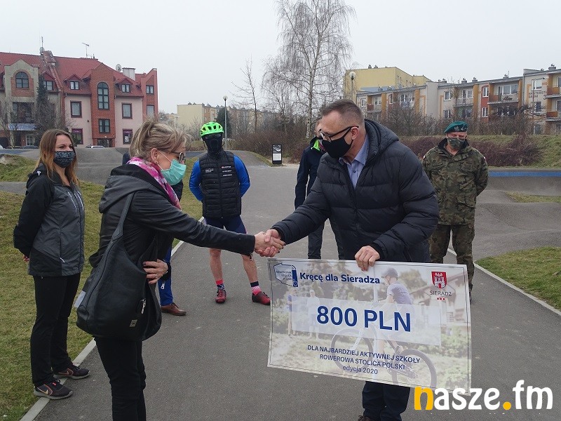 Dzisiejsze spotkanie na terenie pumptracku było też okazją do wręczenia przez prezydenta Sieradza Pawła Osiewałę nagrody za ubiegłoroczny wynik w tej akcji Szkoły Podstawowej nr 10 w Sieradzu. Symboliczny czek na 800 zł odebrała Helena Rajewska, dyrektorka placówki.