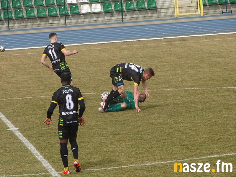 Pierwszą dogodną akcję mieli piłkarze gospodarzy. W 6 minucie Warta ładnie rozegrała pod polem karnym Pogoni, do piłki doszedł Damian Głowacki i oddał strzał nad poprzeczkę. Jeszcze lepszą sytuację miał Adam Patora. Po dośrodkowaniu otrzymał piłkę tuż przed bramkę i uderzył z powietrza. Fantastycznym refleksem popisał się Krzysztof Chruściel i to dzięki swojemu bramkarzowi Pogoń jeszcze nie przegrywała. Zduńskowolanie sami zaczęli utrudniać sobie zadanie. W 27 minucie drugą żółtą kartkę dostał Patryk Retkowski. Warta zaczęła grać w przewadze i natychmiastowo to wykorzystała. Po rzucie rożnym bramkę z główki zdobył Patora. Chwilę później ten sam zawodnik ładnie dograł do Wiktora Płanety, a ten z kilku metrów nie trafił czysto w piłkę. Pod koniec pierwszej połowy kolejną sytuację miał Płaneta. Przegrał jednak z Chruścielem w sytuacji sam na sam.