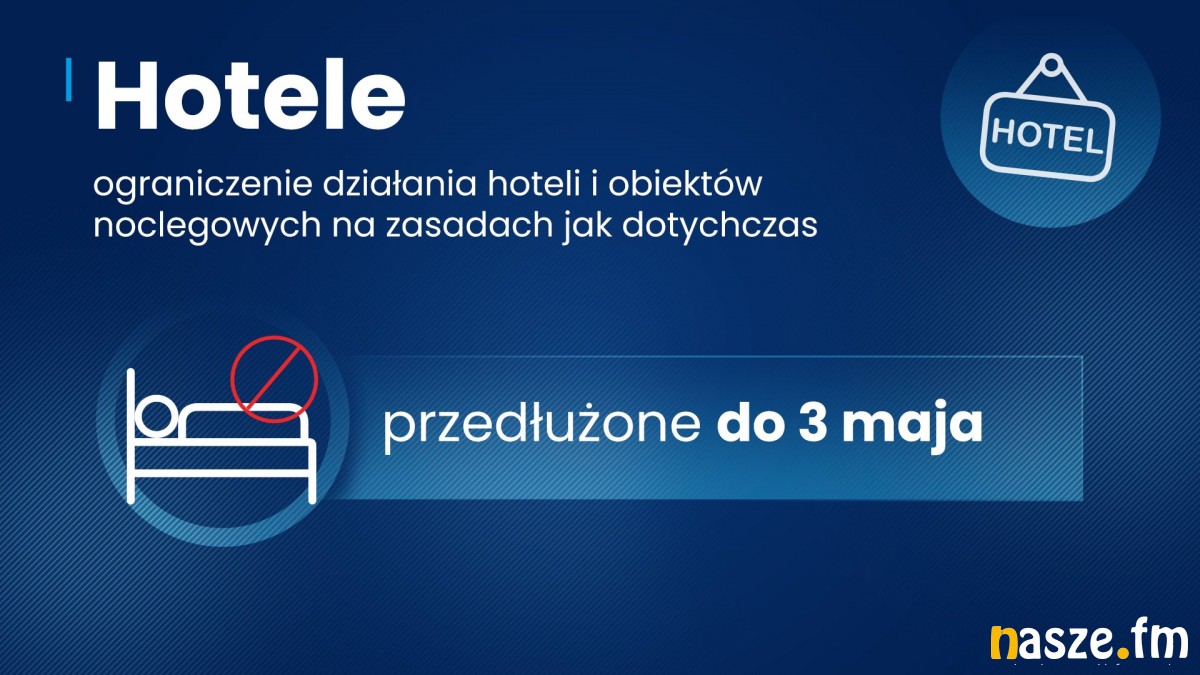 Hotele – obiekty noclegowe pozostają zamknięte do 3 maja włącznie. Wyjątkiem są m.in. hotele robotnicze, a także noclegi świadczone w ramach niektórych podróży służbowych – np. medyków, kierowców wykonujących transport drogowy czy żołnierzy. Dokładny katalog wyjątków wraz z wymaganym potwierdzeniem odbywania podróży służbowej znajdzie się w rozporządzeniu.