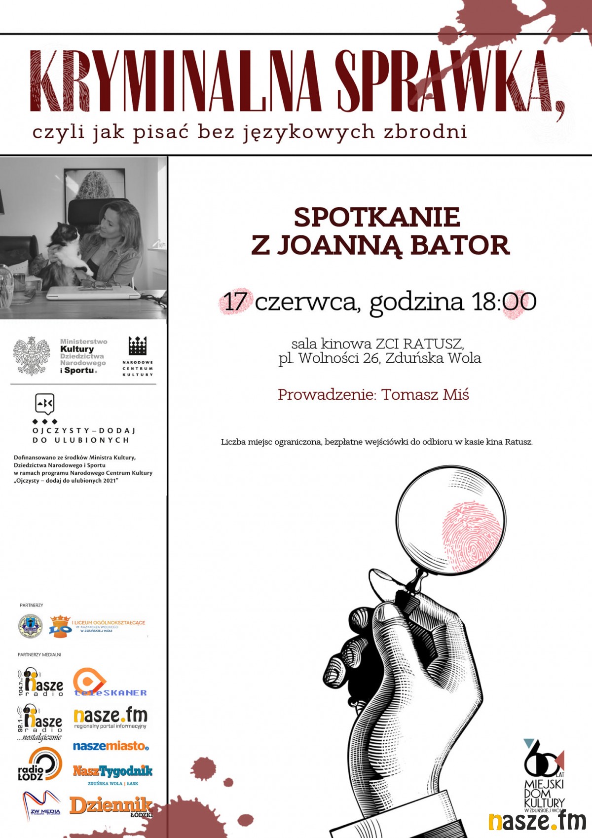 Spotkanie odbędzie się 17 czerwca o godzinie 18.00 w sali widowiskowej w Ratuszu, w ramach projektu "Kryminalna sprawka, czyli jak pisać bez językowych zbrodni" z programu "Ojczysty – dodaj do ulubionych".